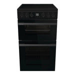 The Hisense HDCEC5C10B is a 50 cm wide freestanding electric ceramic cooker featuring a double-oven design with a 69 litre lower multifunction main oven and a 43 litre upper conventional oven, offering flexibility to handle both everyday meals and large roasts.