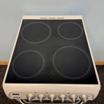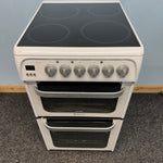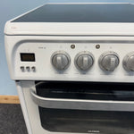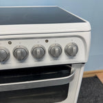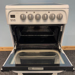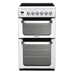 The Hotpoint HUE52PS is a compact 50 cm wide freestanding electric cooker, perfect for kitchens where space is limited but performance is essential. Finished in white with a stylish black glass hob top, it combines practicality with modern looks, making it an ideal choice for smaller households.