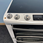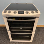 This model features a large 77-litre main fan oven for even heat distribution, ideal for baking and roasting, and a 39-litre top oven that doubles as a conventional oven and full-width grill. The ceramic hob offers four fast-heating zones, perfect for quick boiling or gentle simmering, while its smooth surface makes cleaning simple.